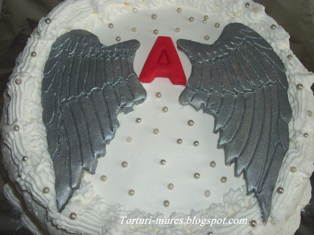 Am ramas restanta cu acest tort pe care l-am facut saptamana trecuta. Un prieten a vrut sa faca un cadou unei domnisoare un tort diplomat imbracat cu frisca care sa aiba pe el niste aripi de inger.