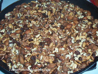 Interiorul e blat insiropat cu sirop caramel, crema de ciocolata si mix de alune, nuci, migdale si stafide prajite.