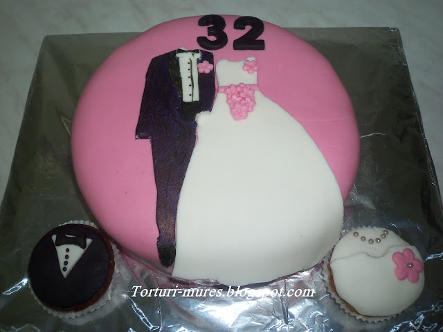 Parintii Adrianei implinesc 32 ani de la casatorie. Adriana s-a gandit sa faca cadou parintilor ei cu aceasta aniversare un tort tematic. Ideea a fost a ei, a vrut un tort simplu roz, cu o rochita de mireasa si un costum de mire + un buchetel de flori si o floricica pe costum.