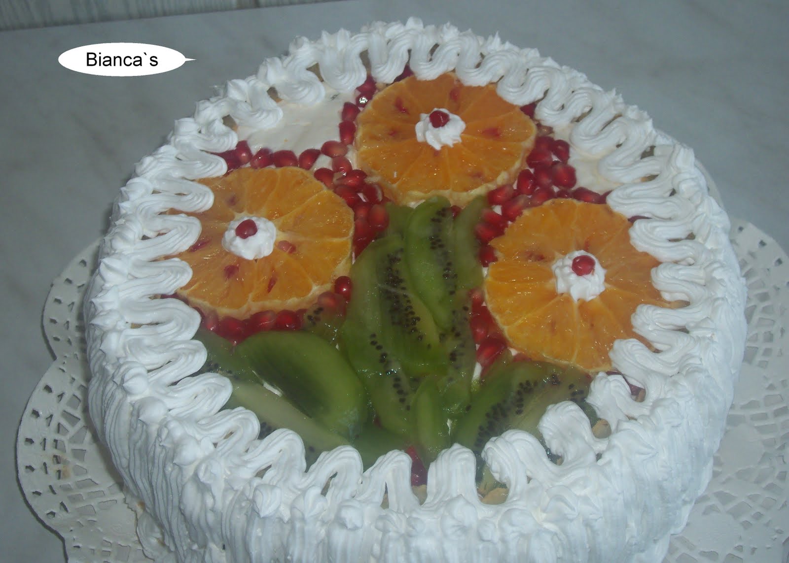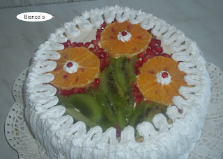 Pentru azi am pregatit un tort diplomat cu fructe: kiwi, portocale, ananas, rodie, banane, stafide inmuiate in rom. Yamy, yamy:)