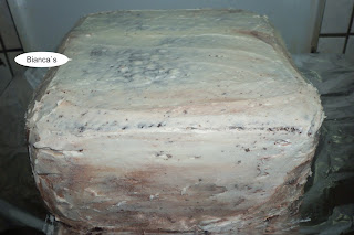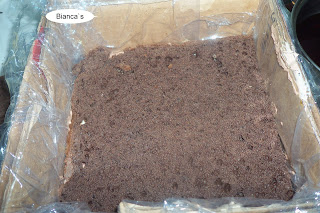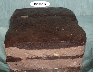 Mai intai am pus blatul pe fundul cutiei si l-am insiropat bine cu sirop caramel (zahar ars stins cu apa). Apoi am pus crema de ciocoala (mousse facut din ciocolata cu frisca)