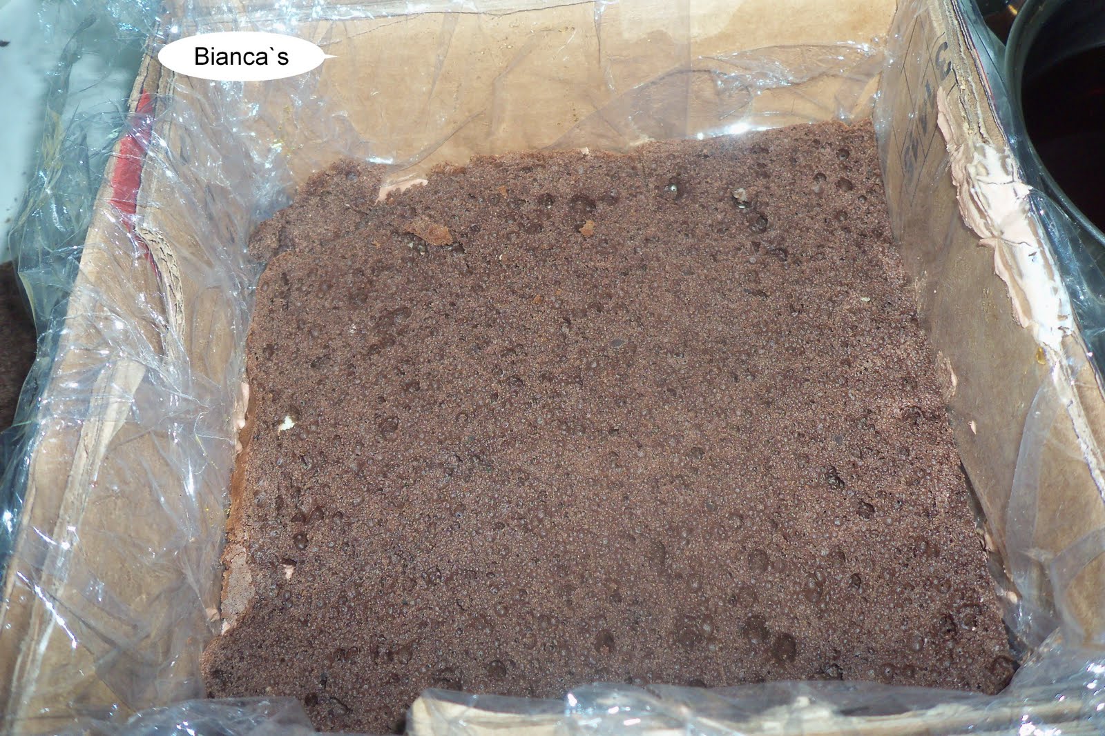 Am luat o cutie de carton pe care am captusit-o bine cu folie alimentara si am inceput constructia tortului.